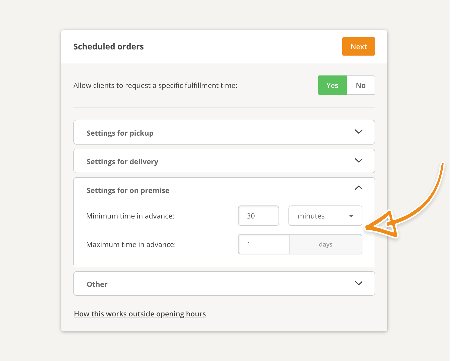 If you accept scheduled on-premise orders, you can now set up a minimum and maximum time in advance. This can help in scenarios like room service orders where guests want to schedule breakfast in advance.